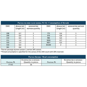 • Количество в соответствии с расходом: В наборе представлено необходимое количество нитей каждого цвета, рассчитанное на основе рекомендаций автора схемы.
