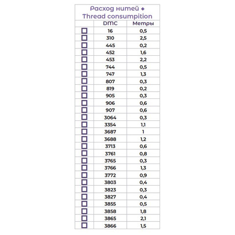 • Количество в соответствии с расходом: В наборе представлено необходимое количество нитей каждого цвета, рассчитанное на основе рекомендаций автора схемы.