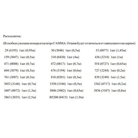 • Количество в соответствии с расходом: В наборе представлено необходимое количество нитей каждого цвета, рассчитанное на основе рекомендаций автора схемы.
